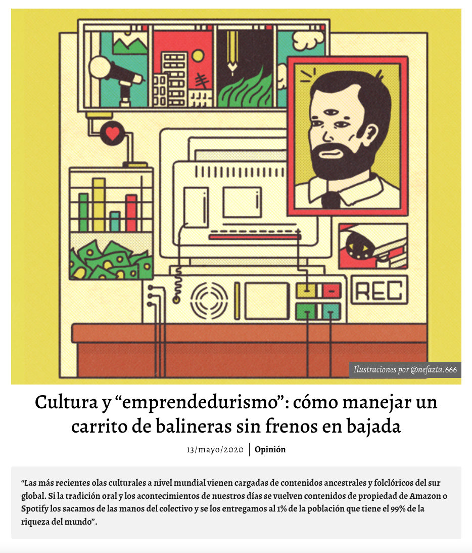 A medida que iba escribiendo proyectos que nos daban la posibilidad de hacer cosas gracias al dinero que lograba recolectar de becas, grants y demás fondos de cultura, empezó a aparecer el fantasma ese del “emprendimiento” y de las “economías creativas”. No es un secreto para nadie que nunca estuve de acuerdo, que aún en medio de las discusiones más fuertes con 15 personas tratando de convencerme, gente que “sí” sabía de cultura y de proyectos creativos, me di la pela de decir que no estaba de acuerdo, que el arte y la cultura no pueden volverse un negocio, que la idea de las expresiones culturales no es hacer billete, que el ser humano necesita el arte, la música y las expresiones culturales para sobrevivir, hasta hice un documental de cómo estas expresiones son claves para hacerle frente a la guerra (¡y lo hice gracias a un grant!).
