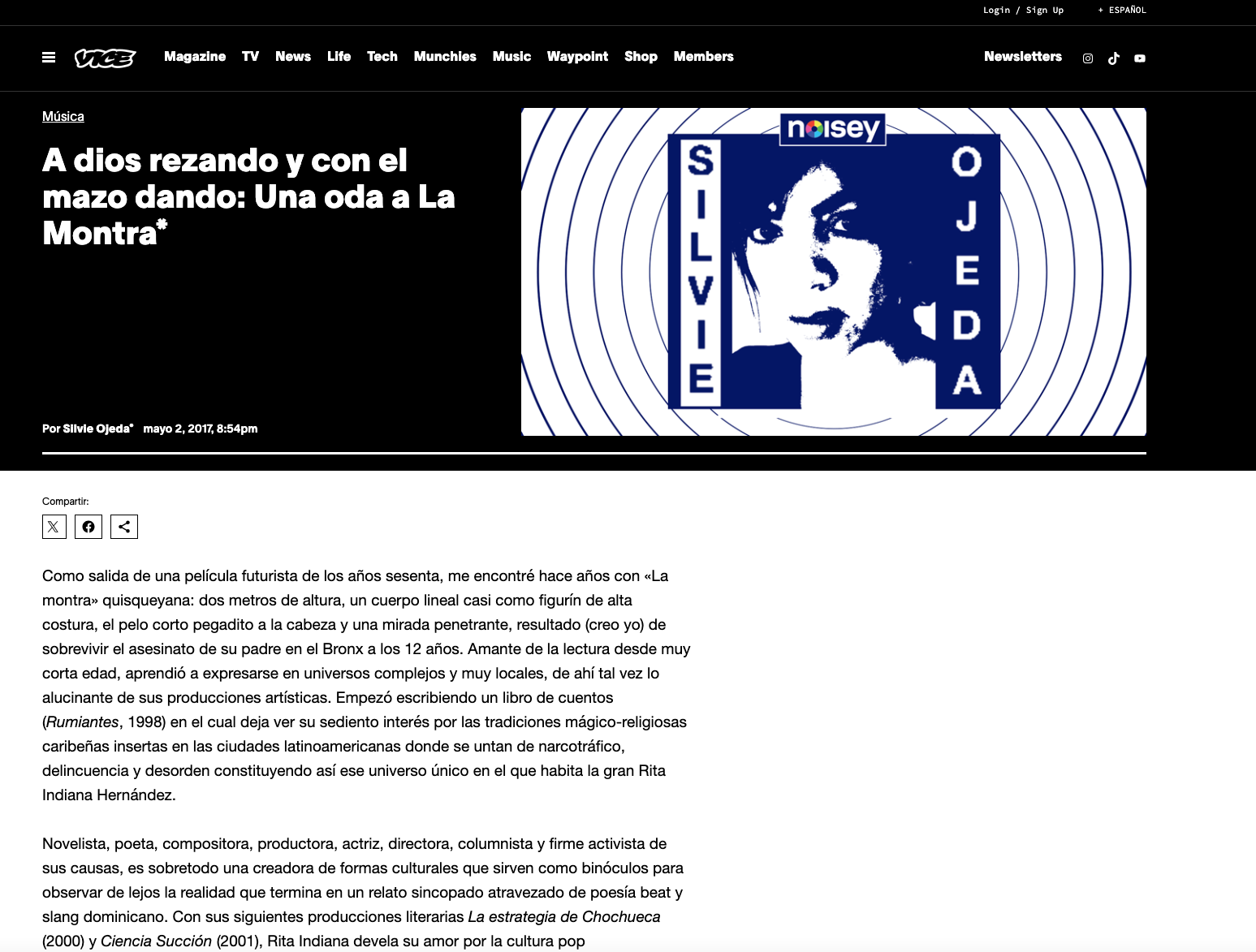 Como salida de una película futurista de los años sesenta, me encontré hace años con «La montra» quisqueyana: dos metros de altura, un cuerpo lineal casi como figurín de alta costura, el pelo corto pegadito a la cabeza y una mirada penetrante, resultado (creo yo) de sobrevivir el asesinato de su padre en el Bronx a los 12 años. Amante de la lectura desde muy corta edad, aprendió a expresarse en universos complejos y muy locales, de ahí tal vez lo alucinante de sus producciones artísticas. Empezó escribiendo un libro de cuentos (Rumiantes, 1998) en el cual deja ver su sediento interés por las tradiciones mágico-religiosas caribeñas insertas en las ciudades latinoamericanas donde se untan de narcotráfico, delincuencia y desorden constituyendo así ese universo único en el que habita la gran Rita Indiana Hernández.